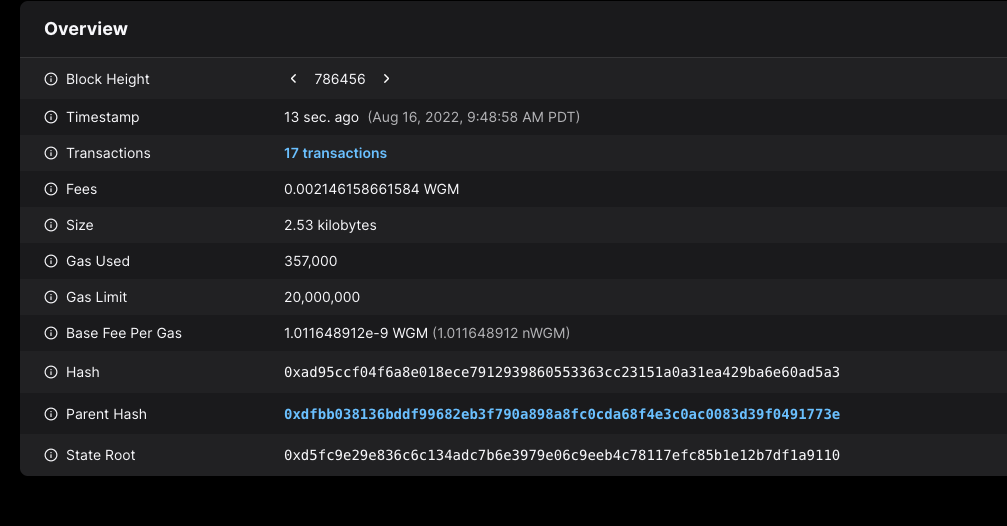 As a result of this transaction, the native minter precompile minted a new native coin (1 WGM) to the recipient address 0xB78cbAa319ffBD899951AA30D4320f5818938310. The address page on the explorer here shows no incoming transaction; this is because the 1 WGM was directly minted by the EVM itself, without any sender.